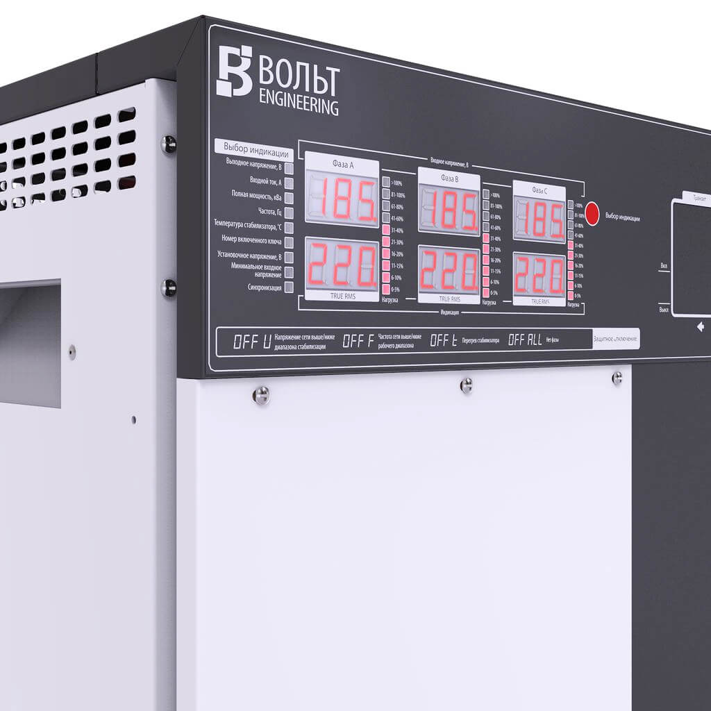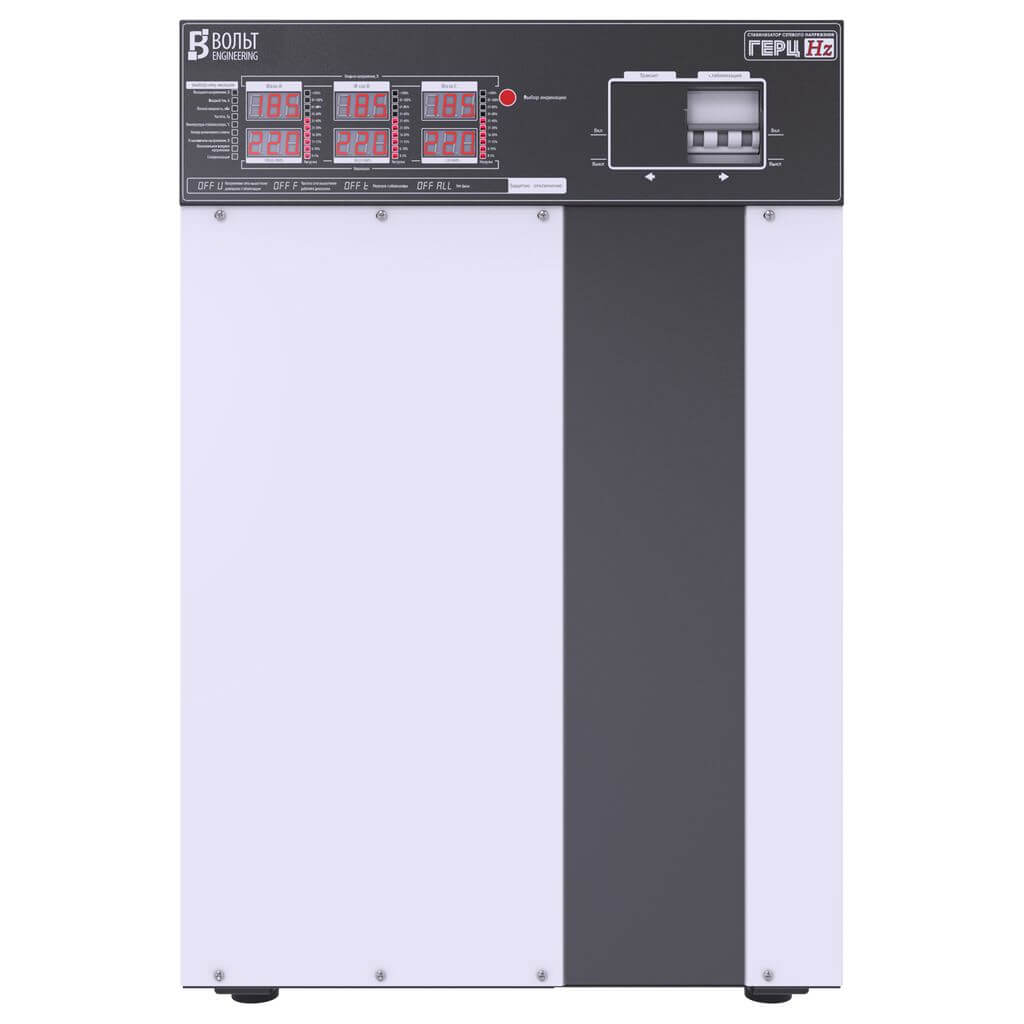 Стабилизатор напряжения Вольт Engineering Герц Э 16-3/40 предназначен для устранения скачков и просадок напряжения в бытовых и промышленных трехфазных электросетях. Стабилизатор является двухрежимным и в зависимости от выбранного режима работы может стабилизировать либо линейное напряжение 380/400В (для промышленности), либо фазное 220/230В на каждой фазе независимо (используются в быту).