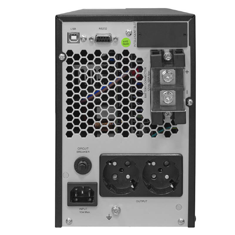 ИБП выполнен по современной технологии «on-line», заключающейся в преобразовании переменного тока в постоянный и его последующей регенерации обратно в переменный. При таком режиме аккумуляторы включены в работу постоянно, и, переход нагрузки на питание от аккумуляторов происходит мгновенно. А выходное напряжение не подвержено влиянию колебаний в электросети, и поддерживается с высокой точностью и идеальной синусоидальной формой в широком диапазоне колебаний и скачков входного напряжения (110 – 300 В).