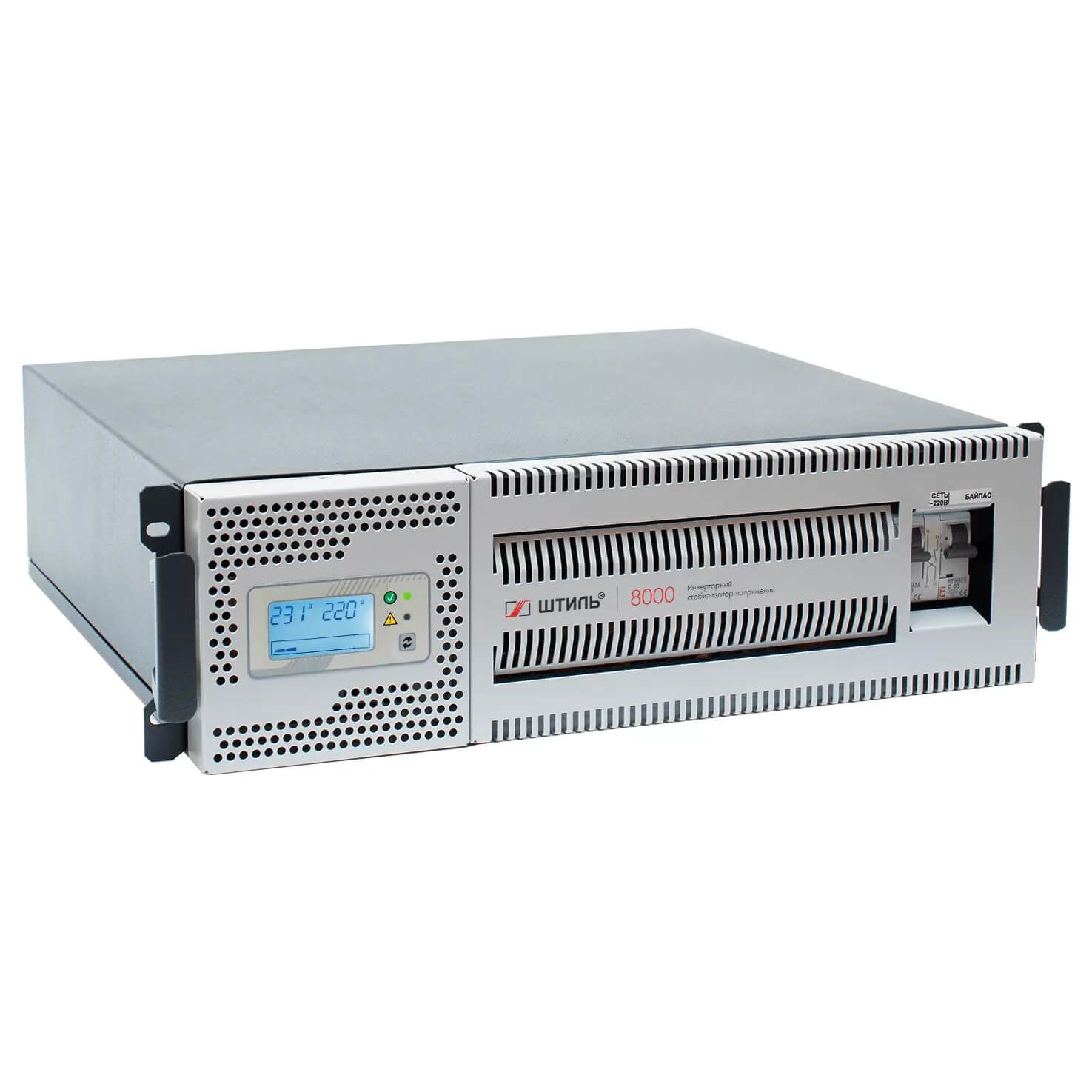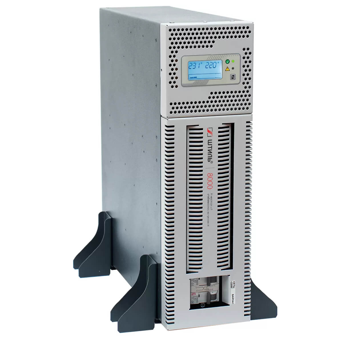 Стабилизаторы Штиль серии RT допускают как вертикальную установку (с помощью специальных упоров), так и горизонтальную, в 19-дюймовые направляющие серверных стоек или шкафов. Все детали для крепления входят в комплект поставки устройства. Стабилизатор оснащен поворотной панелью управления: при смене положения устройства (с вертикального на горизонтальный или наоборот) ее положение тоже можно менять для более удобного использования.
