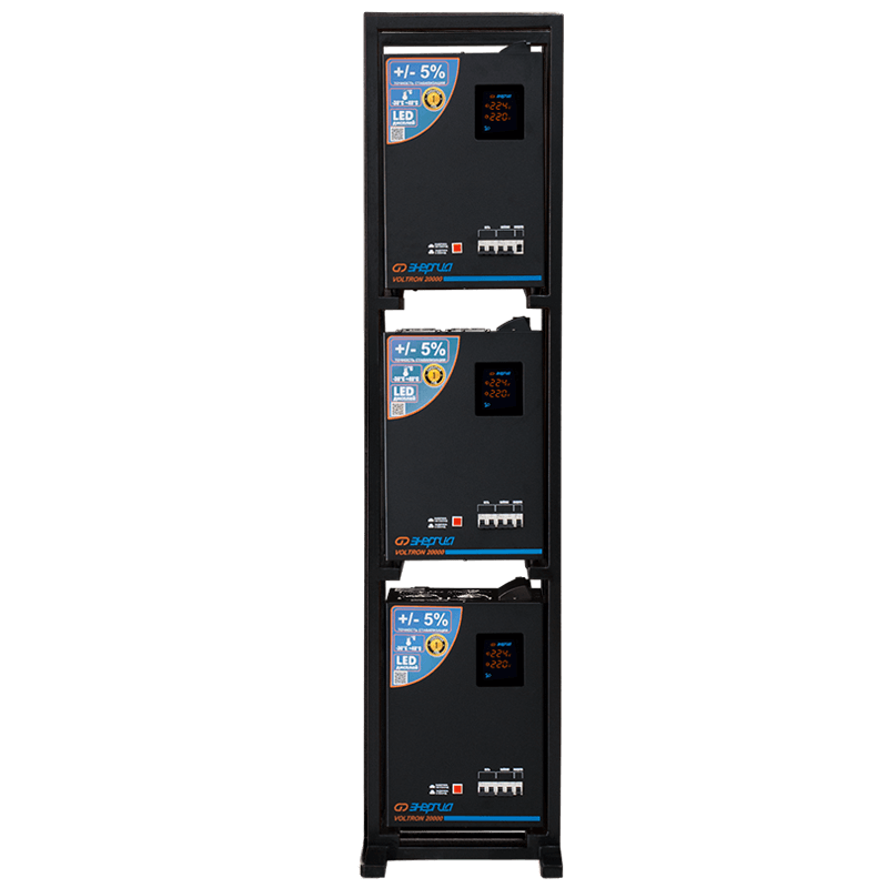 Коммутационная стойка Энергия 163-38-24 предназначена для размещения и подключения стабилизаторов напряжения Энергия Voltron мощностью 15 и 20кВА к трехфазной сети. Стойка максимально адаптирована к данным стабилизаторам по размерам и дизайну. Использование стойки упрощает электромонтаж комплекта стабилизаторов и позволяет минимизировать занимаемую площадь, за счет расположения стабилизаторов друг над другом. При этом остается открытый доступ ко всем элементам управления и коммутационным блокам стабилизаторов, а так же не нарушается режим вентиляции.
