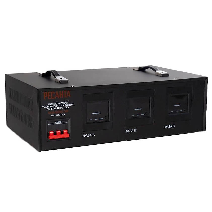 Стабилизатор напряжения Ресанта АСН-3000/3-ЭМ предназначен для работы в бытовых и промышленных трехфазных электросетях. Стабилизатор автоматически поддерживает постоянный уровень напряжения, защищая от скачков, просадок, перекоса фаз, и позволяет избавиться от проблем, вызванных некачественным электроснабжением.