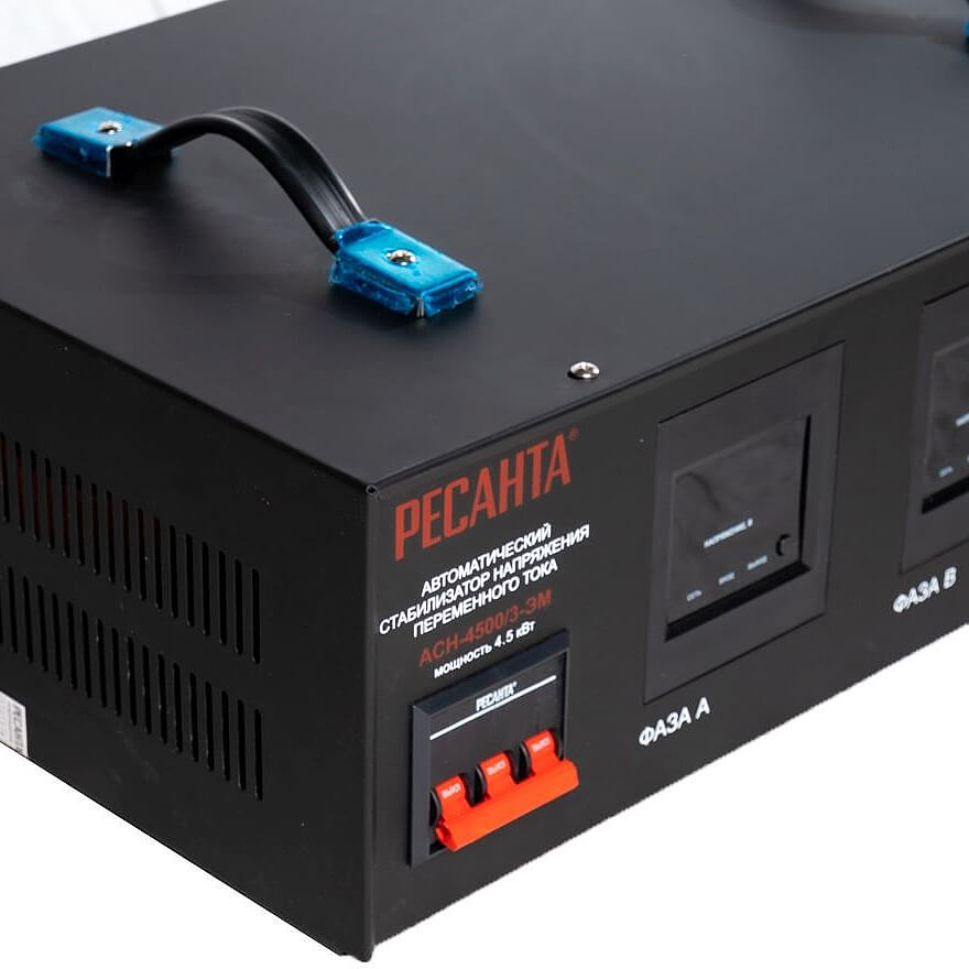 Стабилизатор напряжения Ресанта АСН-4500/3-ЭМ предназначен для работы в бытовых и промышленных трехфазных электросетях. Стабилизатор автоматически поддерживает постоянный уровень напряжения, защищая от скачков, просадок, перекоса фаз, и позволяет избавиться от проблем, вызванных некачественным электроснабжением.