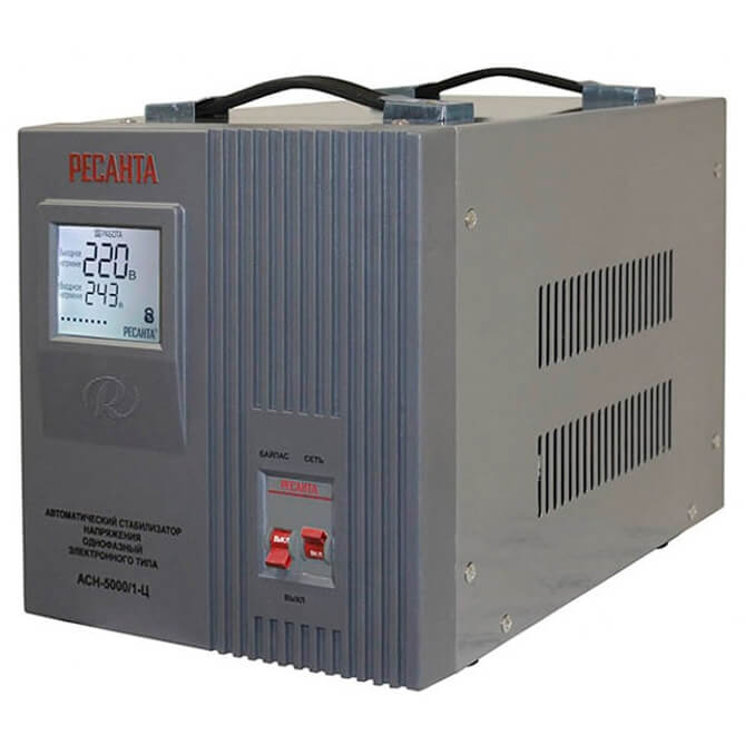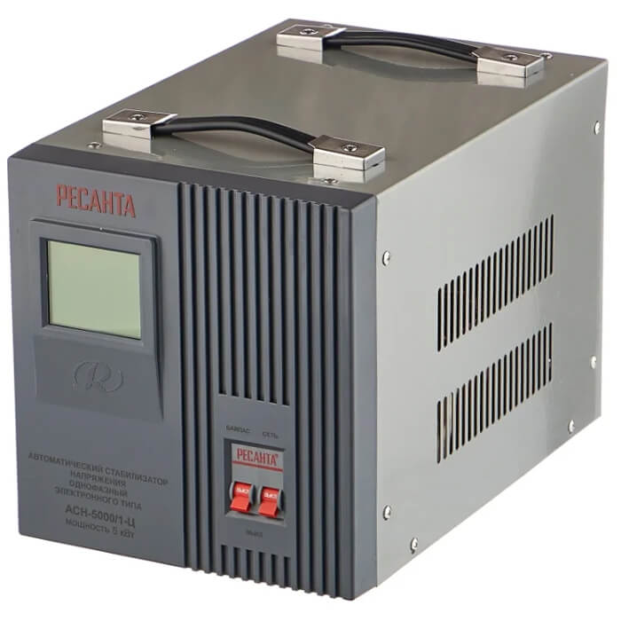 Стабилизатор Ресанта АСН-5000/1-Ц предназначен для выравнивания входного напряжения и защиты приборов от перепадов напряжения с суммарной мощностью до 5 кВт. Стабилизатор оснащен фильтрами сетевых помех, предотвращающими искажение частотной синусоиды, микропроцессорным управлением и цифровым индикатором напряжения, на котором отображаются текущие параметры напряжения. Прочный корпус защищает внутренние узлы аппарата от повреждений.