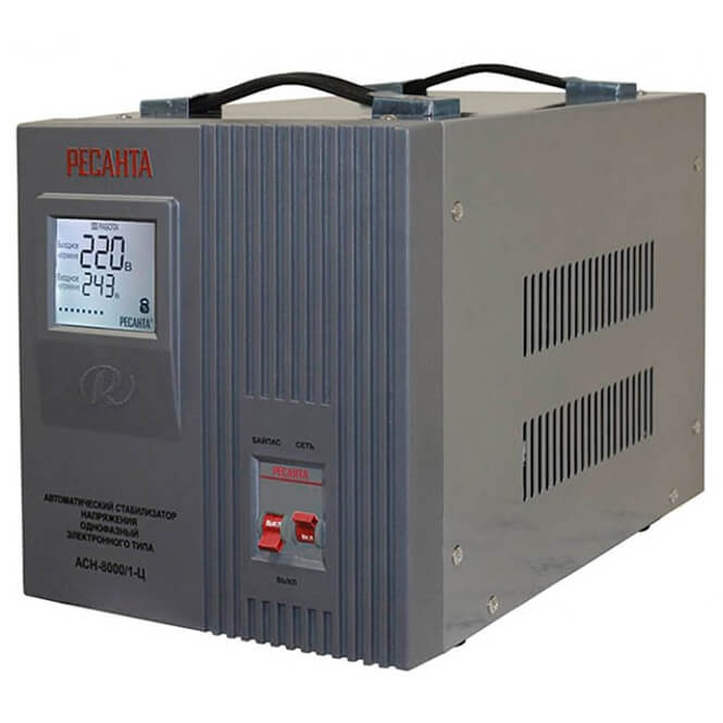 Стабилизатор Ресанта АСН-8000/1-Ц предназначен для выравнивания входного напряжения и защиты приборов от перепадов напряжения с суммарной мощностью до 8 кВт. Стабилизатор оснащен фильтрами сетевых помех, предотвращающими искажение частотной синусоиды, микропроцессорным управлением и цифровым индикатором напряжения, на котором отображаются текущие параметры напряжения. Прочный корпус защищает внутренние узлы аппарата от повреждений.